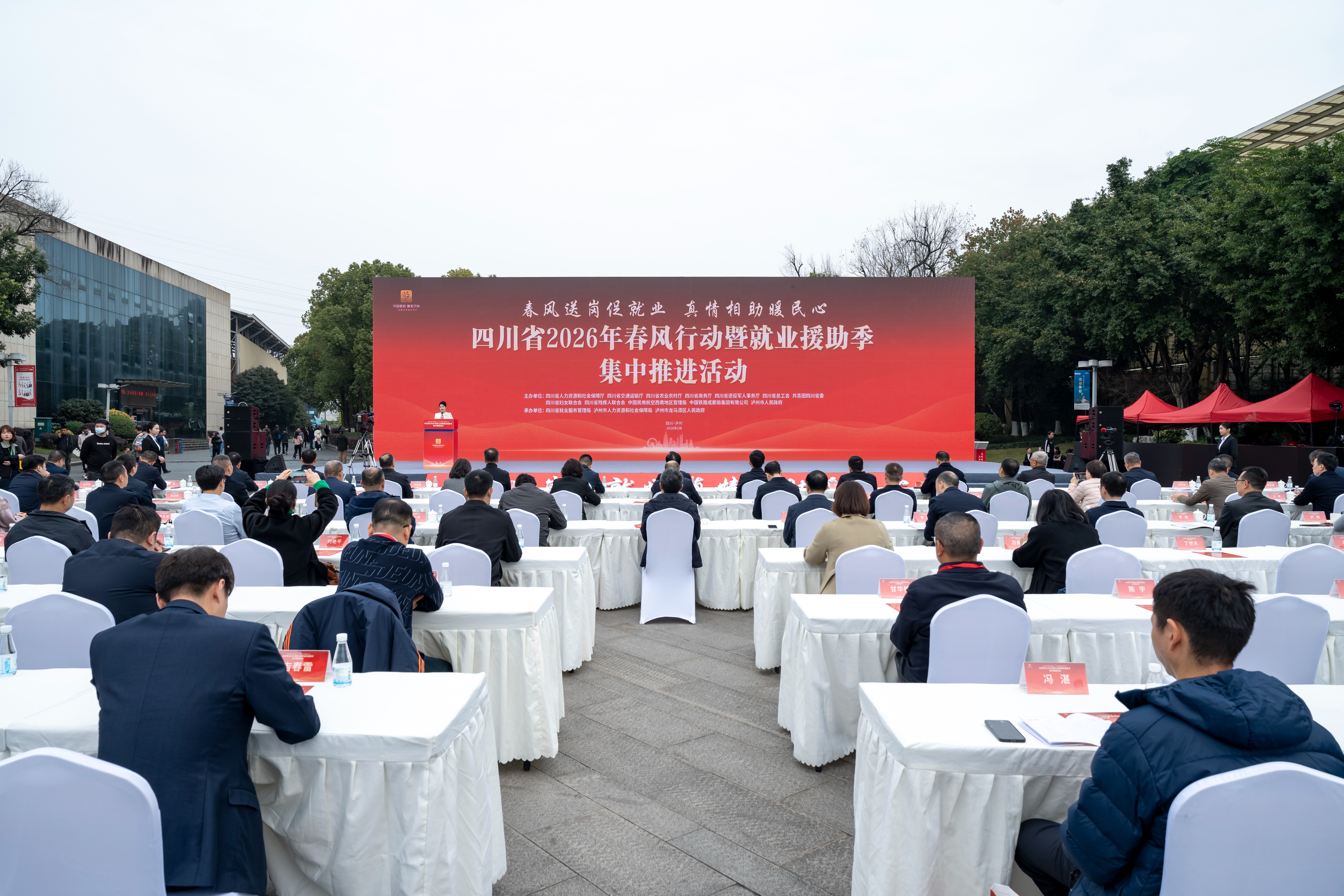 2月25日,由四川省人力资源和社会保障厅、泸州市人民政府共同主办的四川省2026年春风行动暨就业援助季集中推进活动,在泸州市奥林匹克体育公园中心广场举行。活动以“春风送岗促就业 真情相助暖民心”为主题,以“省主会场+市(州)分会场”形式进行,通过专场招聘、发送返岗专车、包机等服务,在春节收假后第一时间为求职者和用人单位搭建供需平台,以就业开局争先,助力经济社会高质量发展。